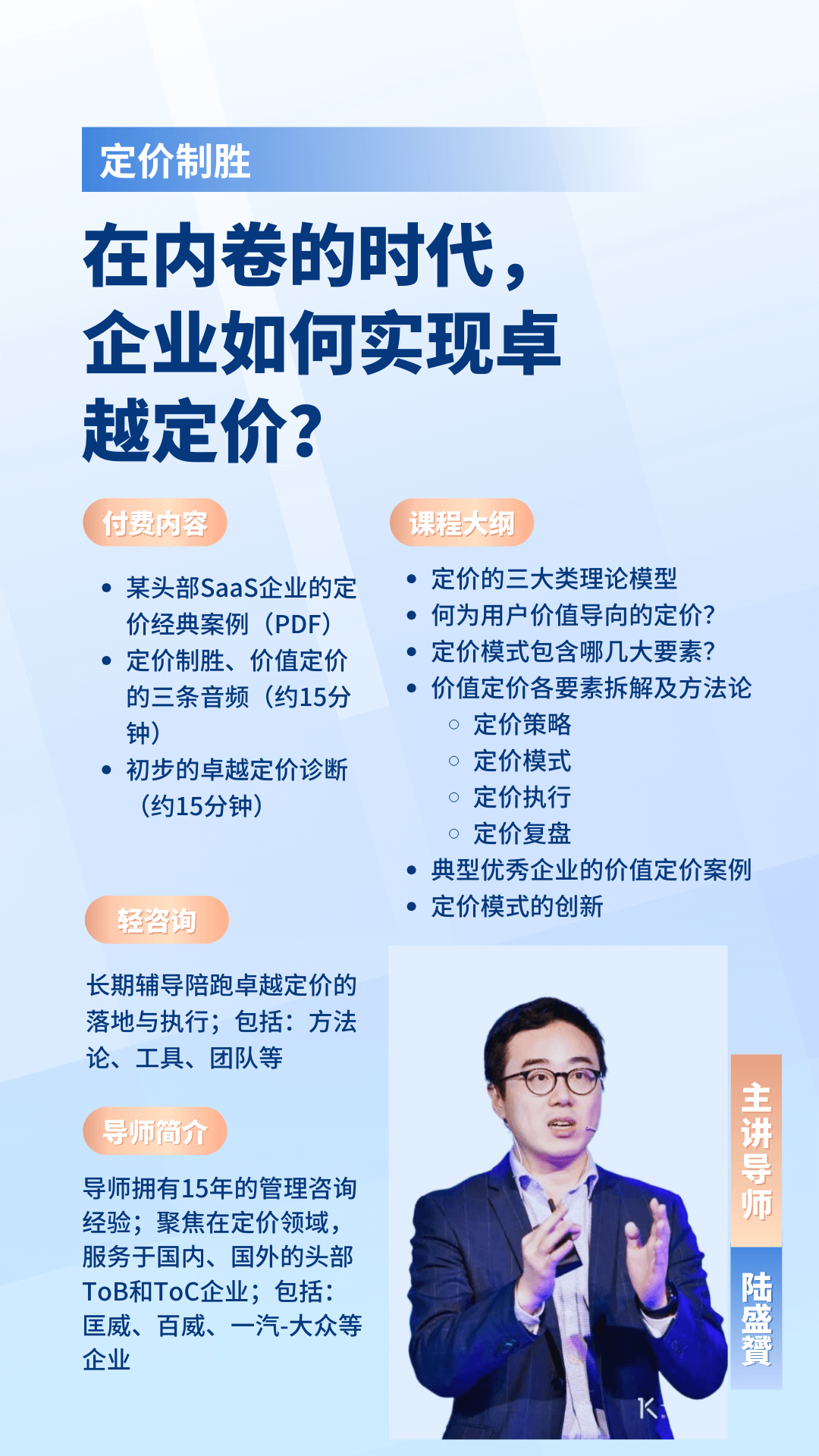 拥有15年的管理咨询经验;聚焦在定价领域:服务于国内、国外的头部ToB和TOC企业;包括:匡威、百威、一汽-大众等企业。